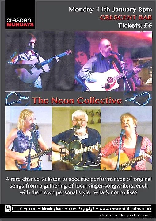 Sat 16 Apr : The Neon Collective : Local singer-songwriters on tour : Birchmeadow Centre, Broseley, Shropshire. Doors 7.30 pm. Evening starts 8.00 pm.